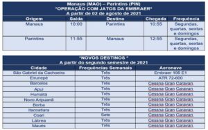 A demanda por parte dos Clientes e o interesse em seguir expandindo sua malha aérea em Parintins e em todo o estado do Amazonas fizeram a Azul revisitar sua estratégia de operação no município, que passará a receber voos com aeronaves maiores. A partir de 02 de agosto, as frequências, antes cumpridas com os aviões Cesnna Gran Caravan, de nove assentos, da Azul Conecta, serão realizadas com os jatos da Embraer, modelo E-195, para 118 Clientes. As passagens para voos com a nova aeronave já estão disponíveis para compra em todos os canais oficiais da empresa a partir de R﹩ 199,96*
