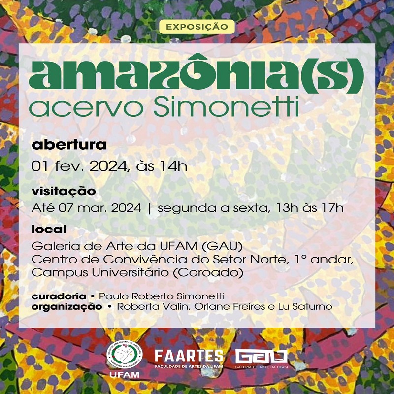 No dia 1º de fevereiro, a partir das 14h, a Galeria de Arte da Ufam (GAU) realiza a abertura da exposição “Amazônia(s) – acervo Simonetti”, composta por 49 obras do acervo pessoal do professor, artista e pesquisador Paulo Roberto Simonetti, docente da Faculdade de Artes (Faartes).
